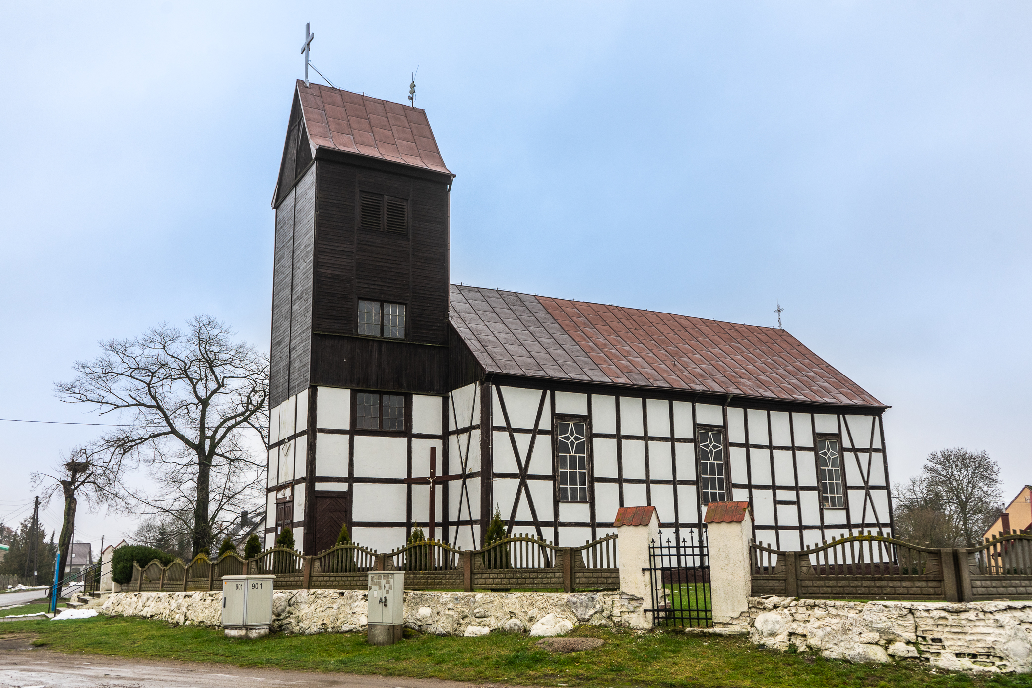 The history of the church in Białogórzyno goes back to the year 1838. It was funded by the von Bonin family and King Friedrich Wilhelm III. Originally a Protestant temple, after World War II it was taken over by the Catholic community. The church is a half-timbered structure. In the front, there is a bell tower added in 1935 with two bells. Inside, you can see the original organ gallery on columns, and a 19 th -century suspended candle holder. The three-piece main altar originating from 1914 came the church from the temple in Drawsko Pomorskie.